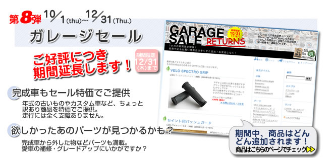 | | 2009年4月1日~2009年12月31日までに、1回につき合計金額(税込)が10万円以上、通信販売をご利用いただいた場合に限り運送料・梱包料をサービスいたします。 北海道・沖縄県・一部の離島への配送の場合は対象外とさせていただきます。 詳細についてはご注文後にメールにてご案内させて頂きます。 | | | 期間中に車体をお買い上げの方をホームページにてご紹介します。 愛車の購入の記念に・自慢にぜひご参加ください。 掲載ご希望の方は、購入時にスタッフまでお申し付け下さい。 お名前・お住まいの地域を掲載させて頂きます。 ホームページ上への公開は5月から順次行います。 | |