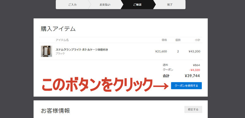 割引を利用するためにはそれぞれのクーポンコードを注文確認画面の