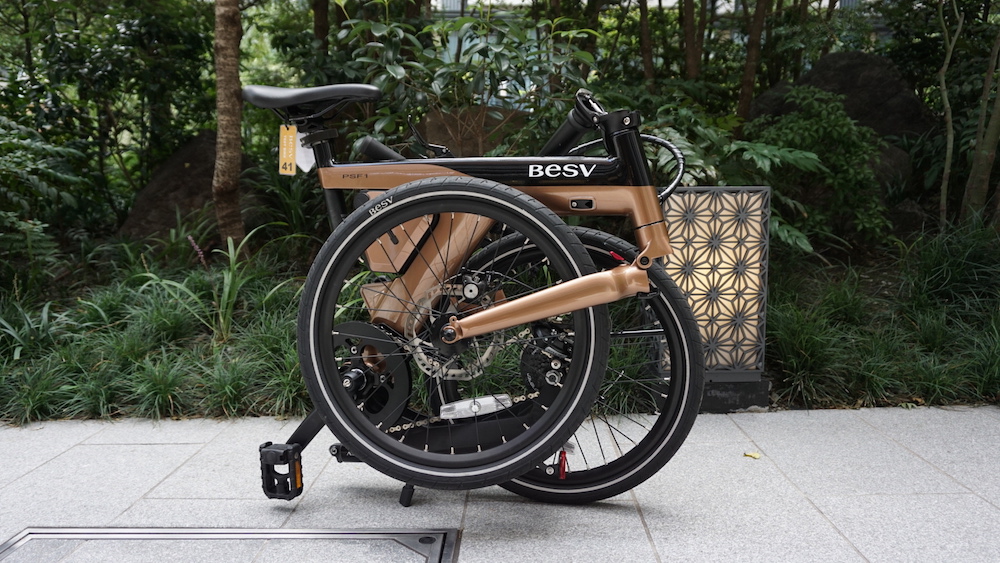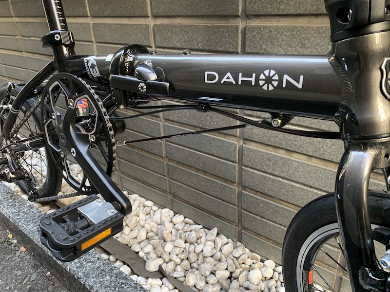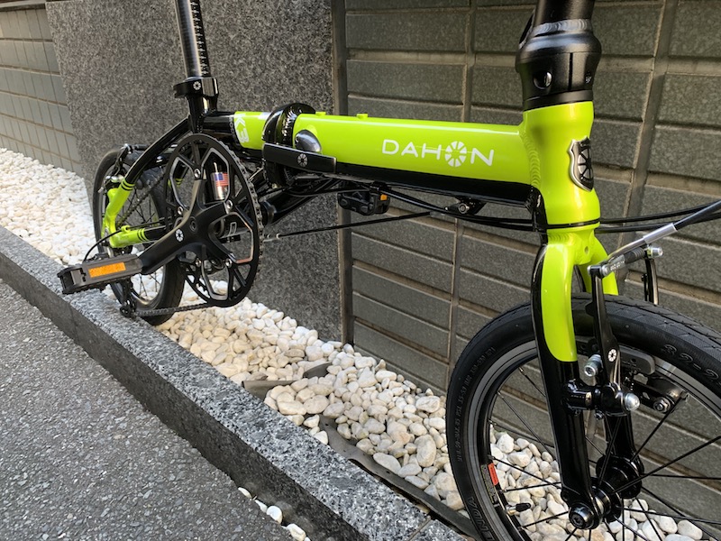 なお、折りたたんだ際ドライブトレイン(スプロケットやチェーンやディレーラーなどの駆動パーツのこと)が内側になるので、折りたたんだ状態での耐久性も高そうです。