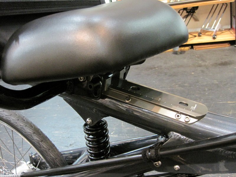 シートの調節は、クイックレバーでレール上をスライドさせる。