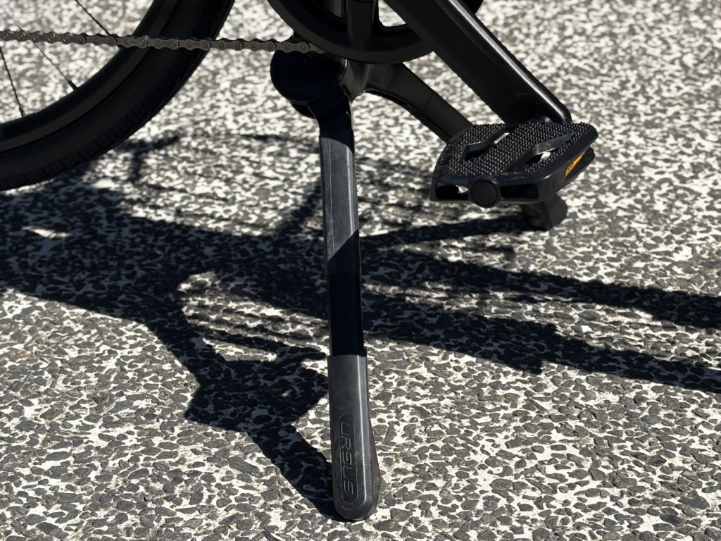 取り付けたのは《URSUS Jambo EVOキックスタンド》2本足で車体を支える構造のため、通常の片脚スタンドよりも圧倒的に安定感が高いです。折りたたみ時もスマートに収まってくれます。