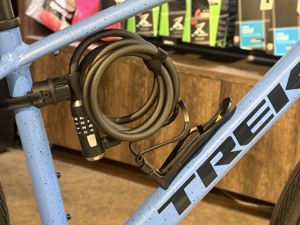 鍵は前回も取り付けた《KryptoFlex1218 ComboCableLock》を、伸ばすと全長180cmもあるのでフレームとホイールだけでなく人口の構造物に巻き付け(地球ロック)をすることでセキュリティーを強化。