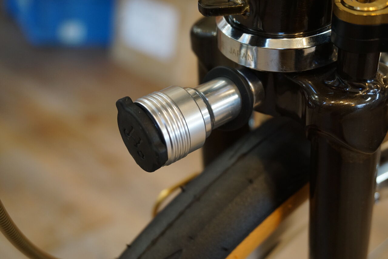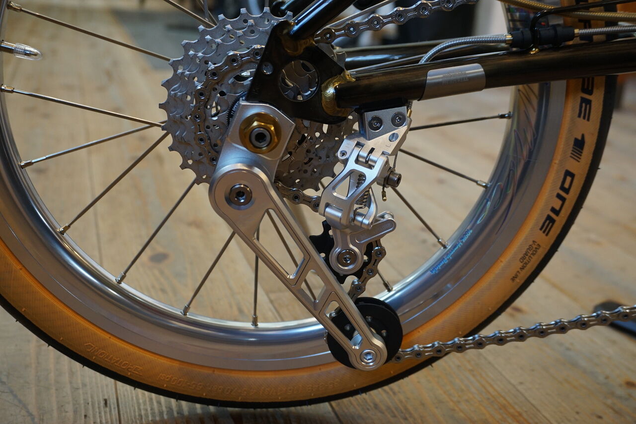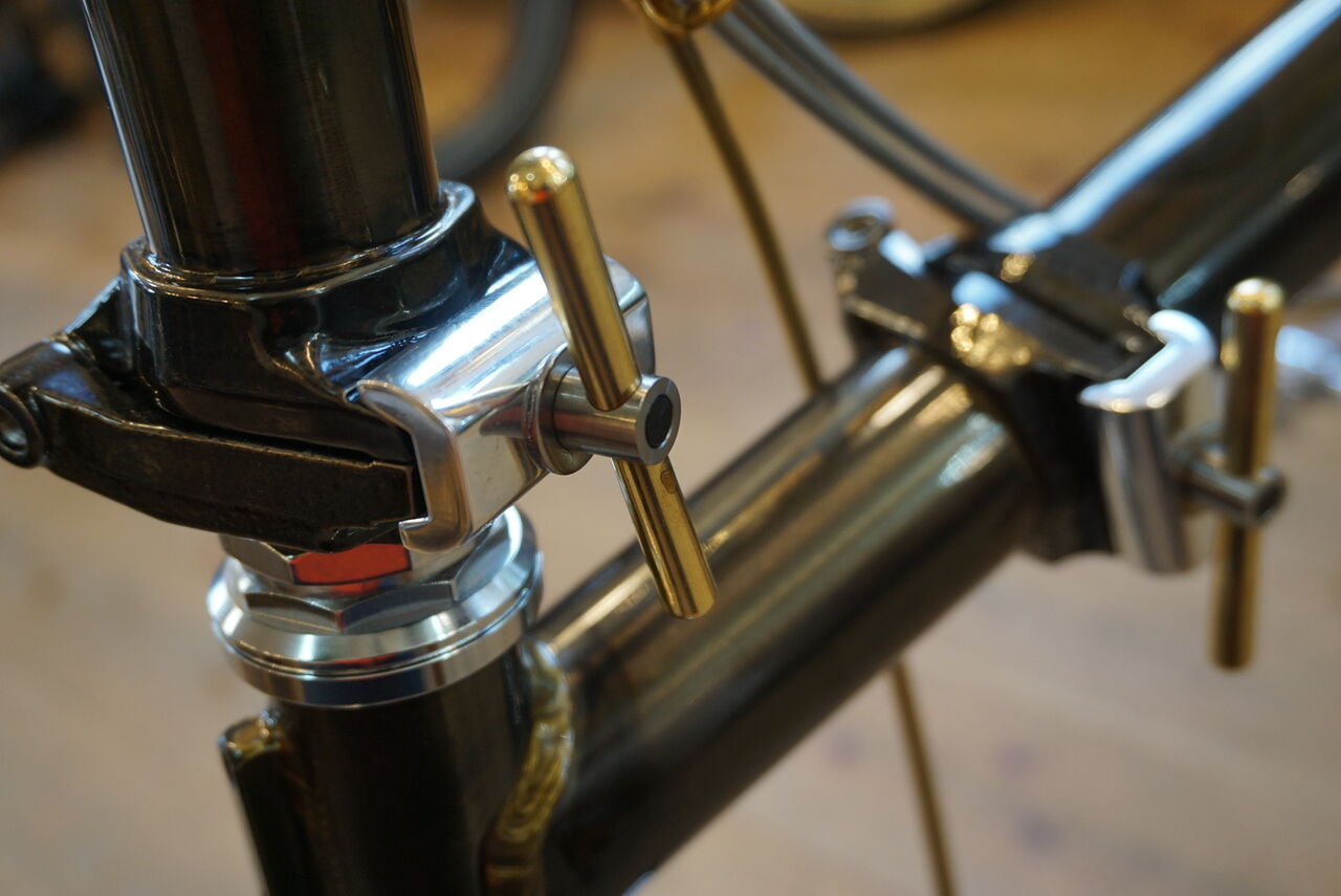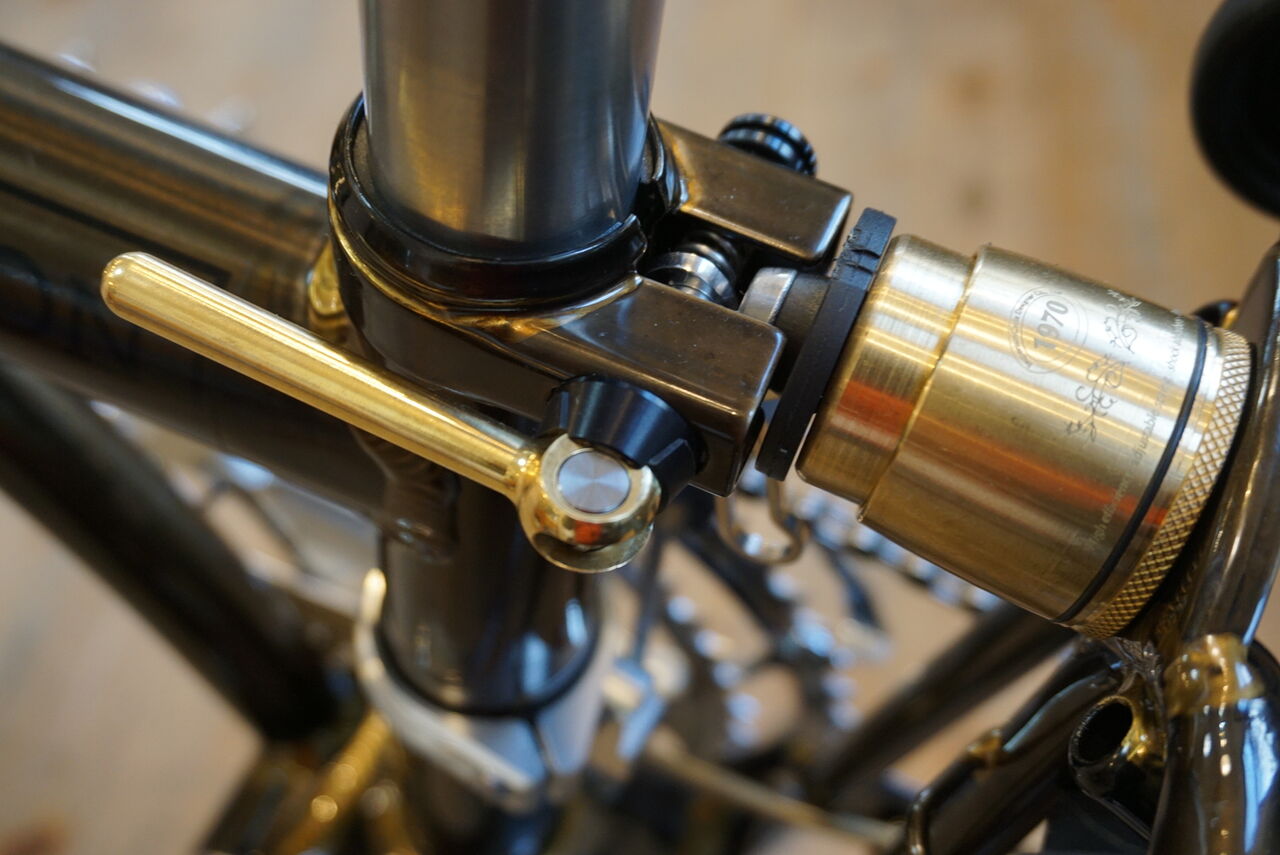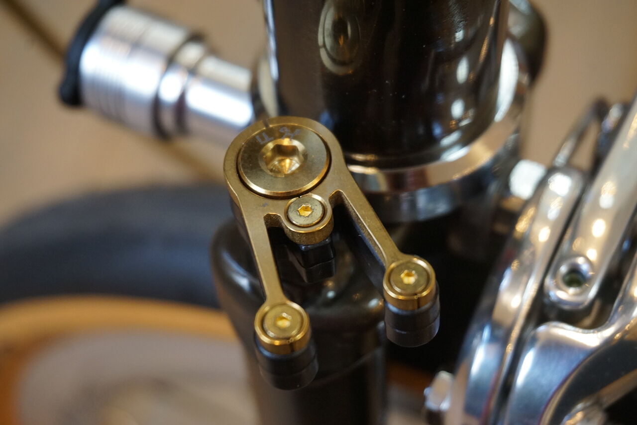 シートクランプは「Brompfication Seat Clamp Quick Release」サスペンション解除レバーは「Brompfication Rear Frame Clip」にリアサスペンションは「Multi-S Rear Suspensions British Retro」ここにブラス(真鍮)の塊を持ってくることにより、高級感が増しましです