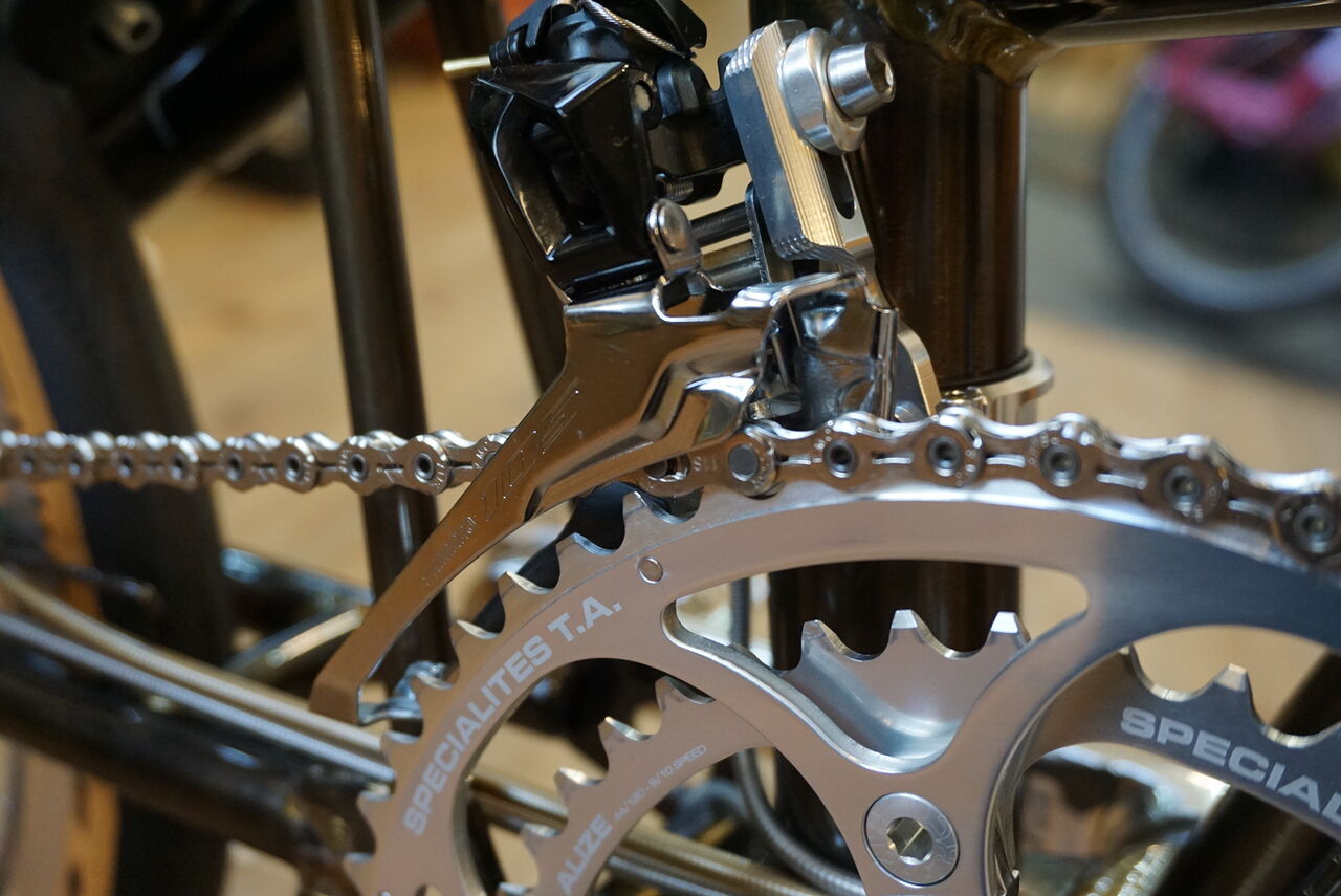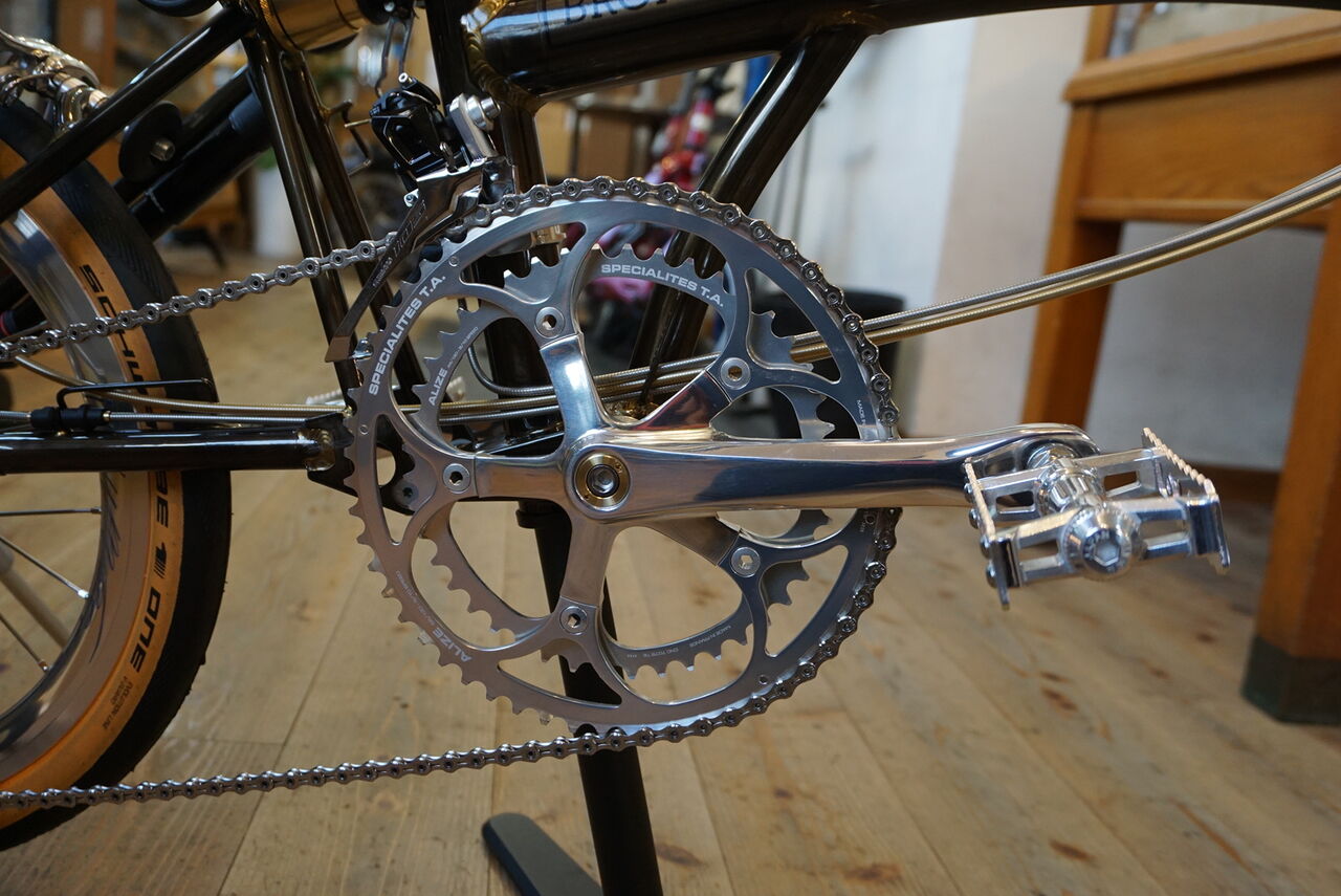 自転車の顔!ともいわれるクランクセットは「【ポリッシュ加工品】スギノ RD4 170mm」にmade inフランスの「T.A ALIZE 56T&44T」でフロントダブル化しています