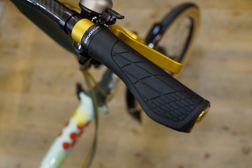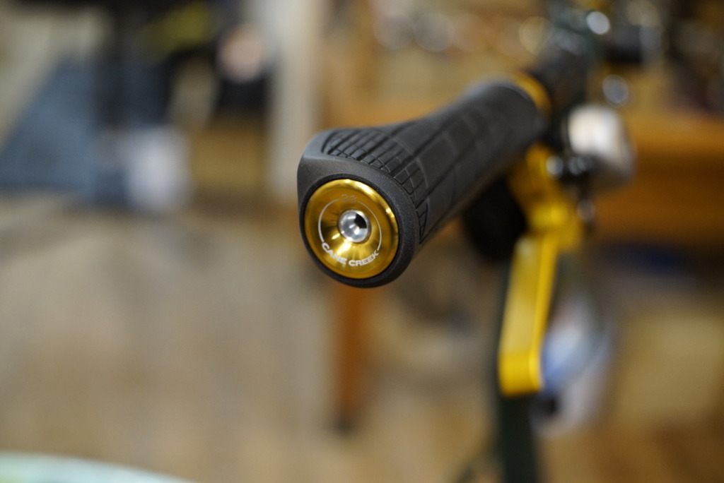 ERGON グリップのバーエンドでも自然でいいですが、今回eebrakeをお取り付けさせていただくので、これでしょ!な感じでお取り付けさせていただきました。