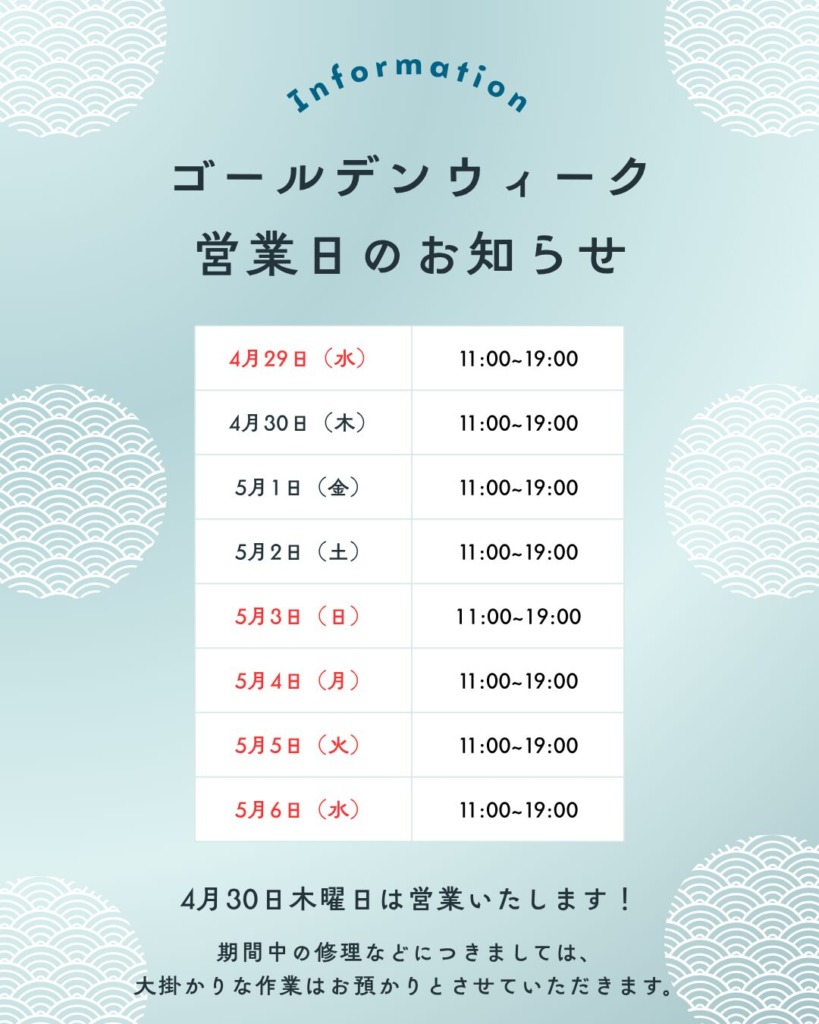 明日からのゴールデンウィーク期間も連日営業しております!