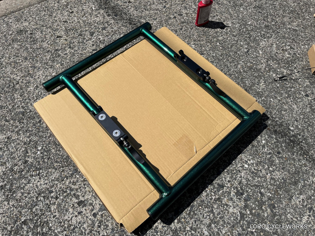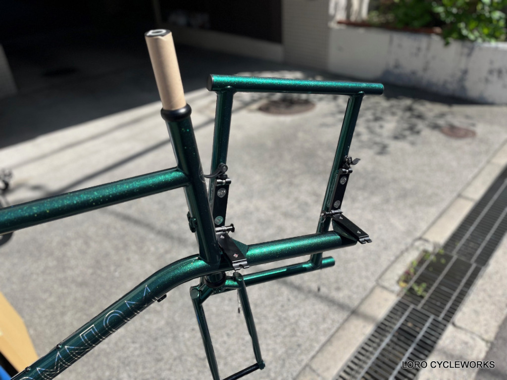 先ほどのブラケットパーツをフレームとラックに取り付けることにより、フロントラックフレームを折りたたみ可能に!