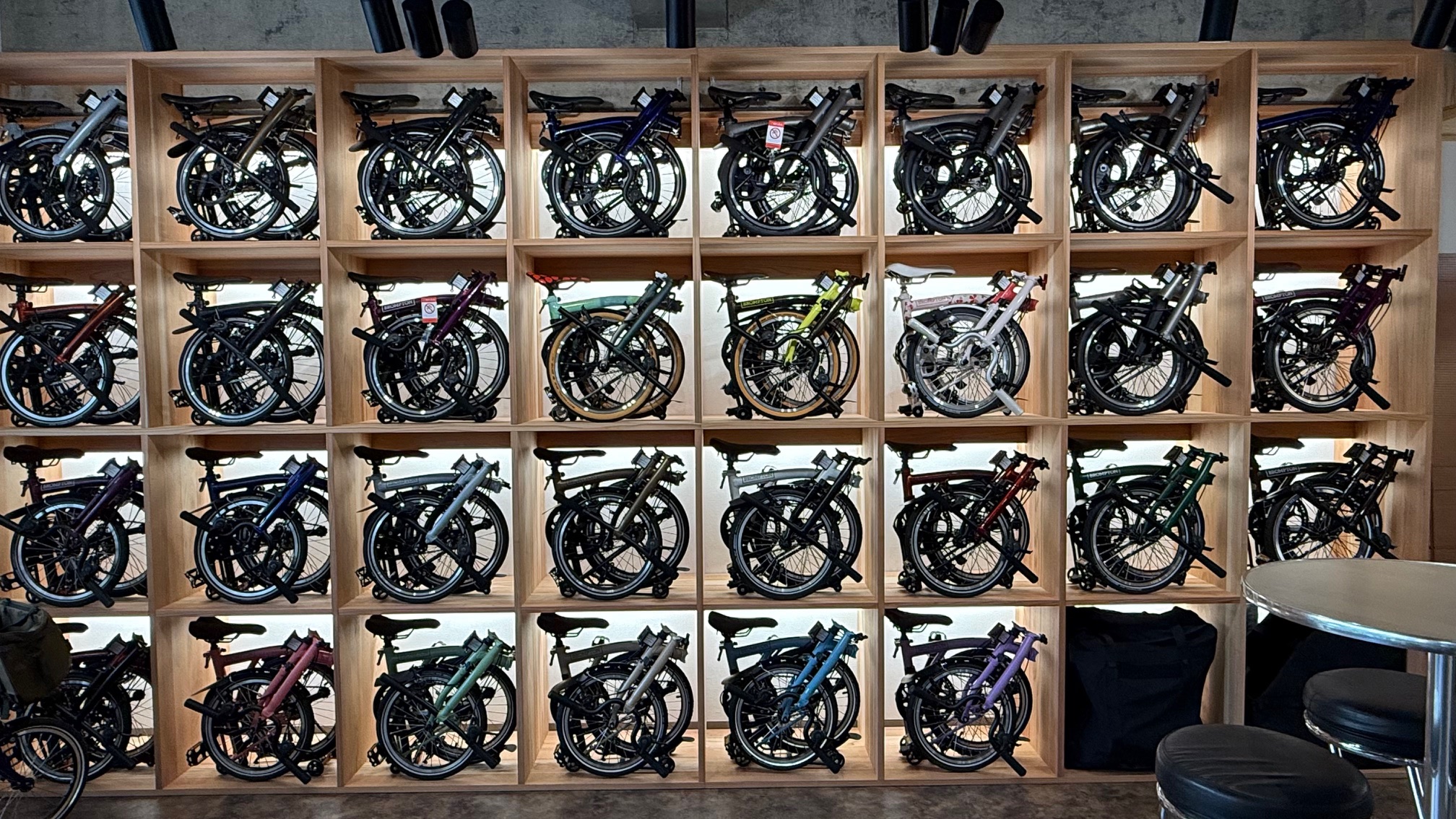 入店してまず目に入るのは、壁一面に広がるBROMPTONの展示。