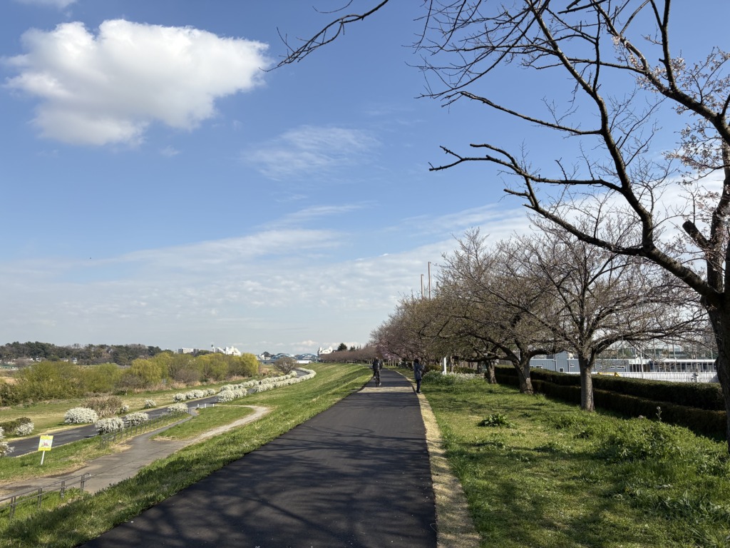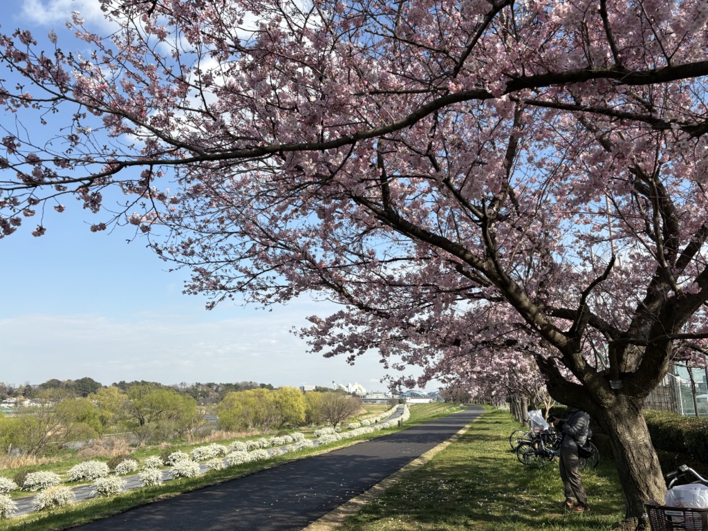 4月上旬ぐらいになると多摩川沿いは桜満開になります。