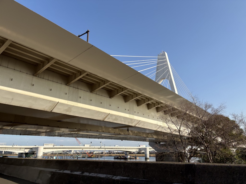 2022年に開通した、全長が約675m多摩川で一番海に近い橋《多摩川スカイブリッジ》を渡って川崎市に入ります。