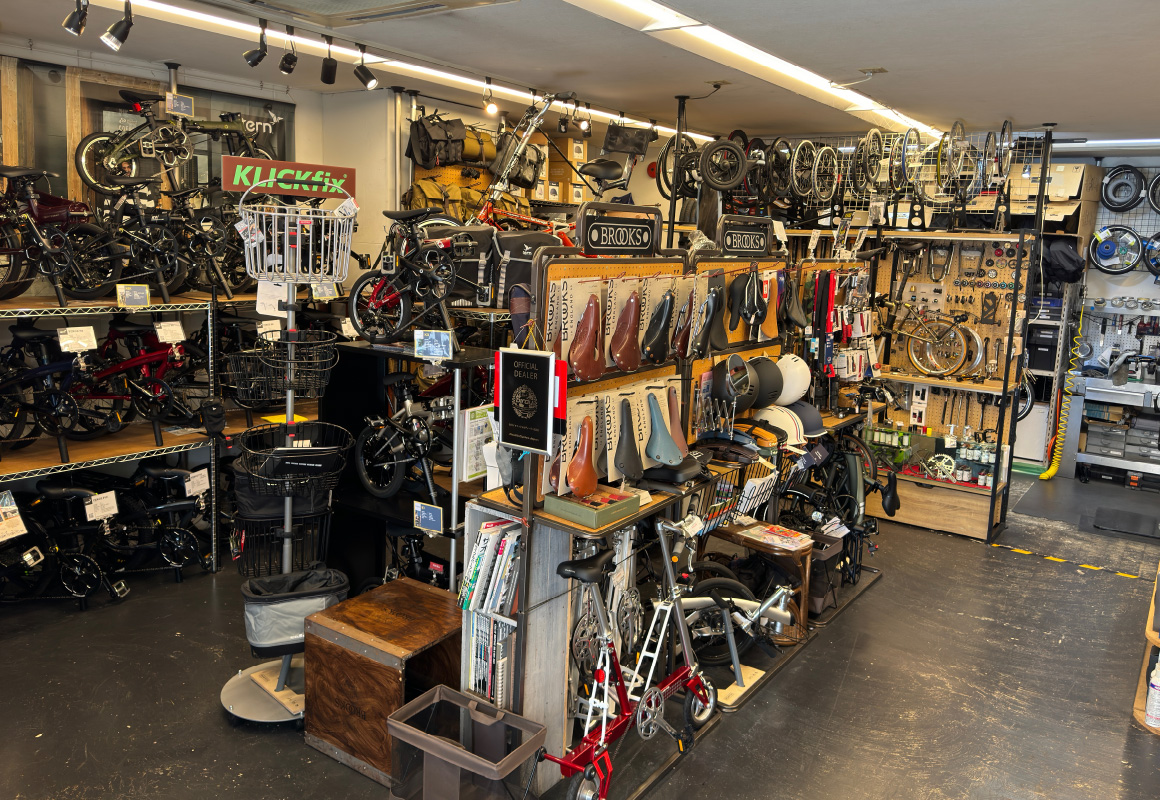 ブロンプトン、birdy、Tyrellなどを中心に折りたたみ自転車、ミニベロを置いております。それらのアフターパーツも多数展示しておりますので、愛車のお困りごとやカスタマイズなどもお気軽にご相談いただけます。